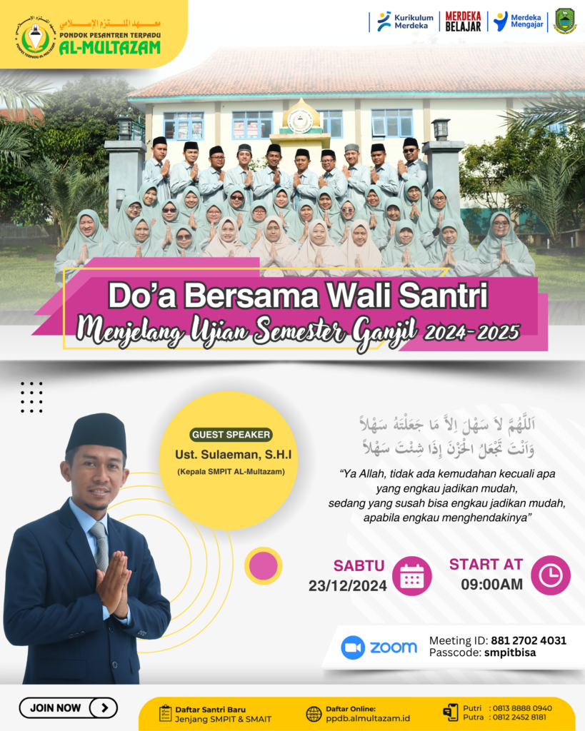Kegiatan Sekolah Wawasan Pendidikan SMPIT AL-MULTAZAM June 5, 2025 0 Comments Doa Bersama Menjelang Ujian bersama Wali Santri