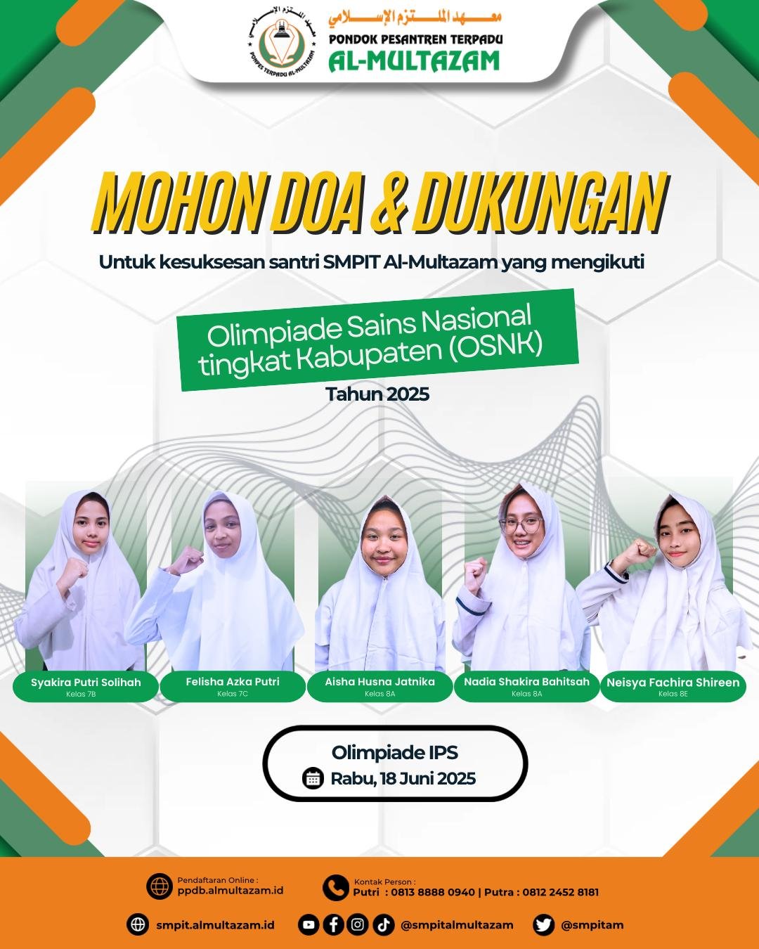 Prestasi Sekolah SMPIT AL-MULTAZAM April 14, 2026 0 Comments MOHON DOA DAN DUKUNGAN SANTRI MENGIKUTI OSN KABUPATEN